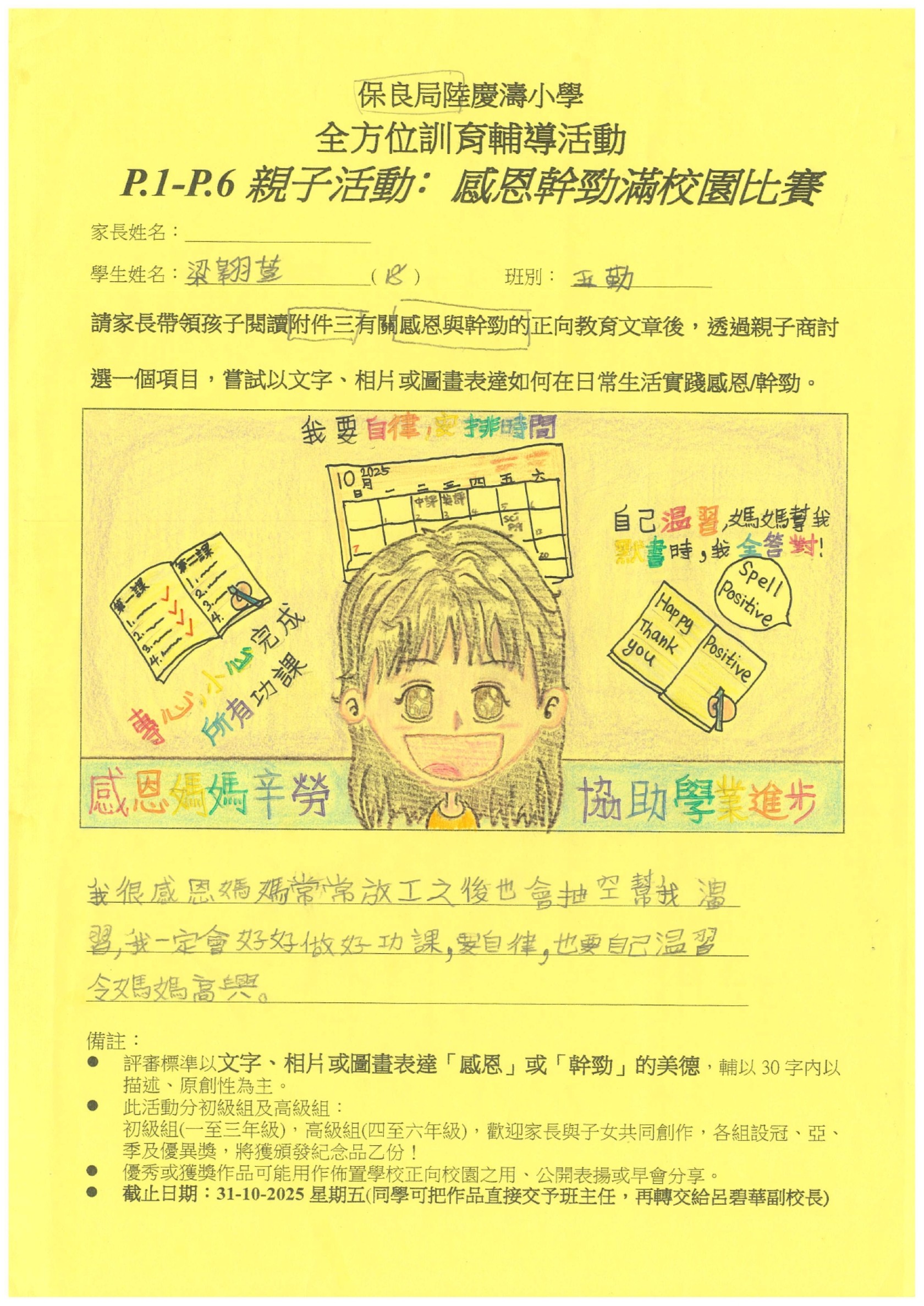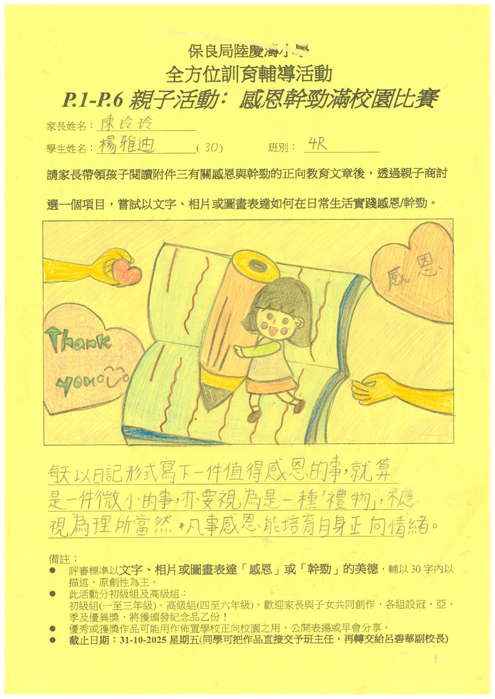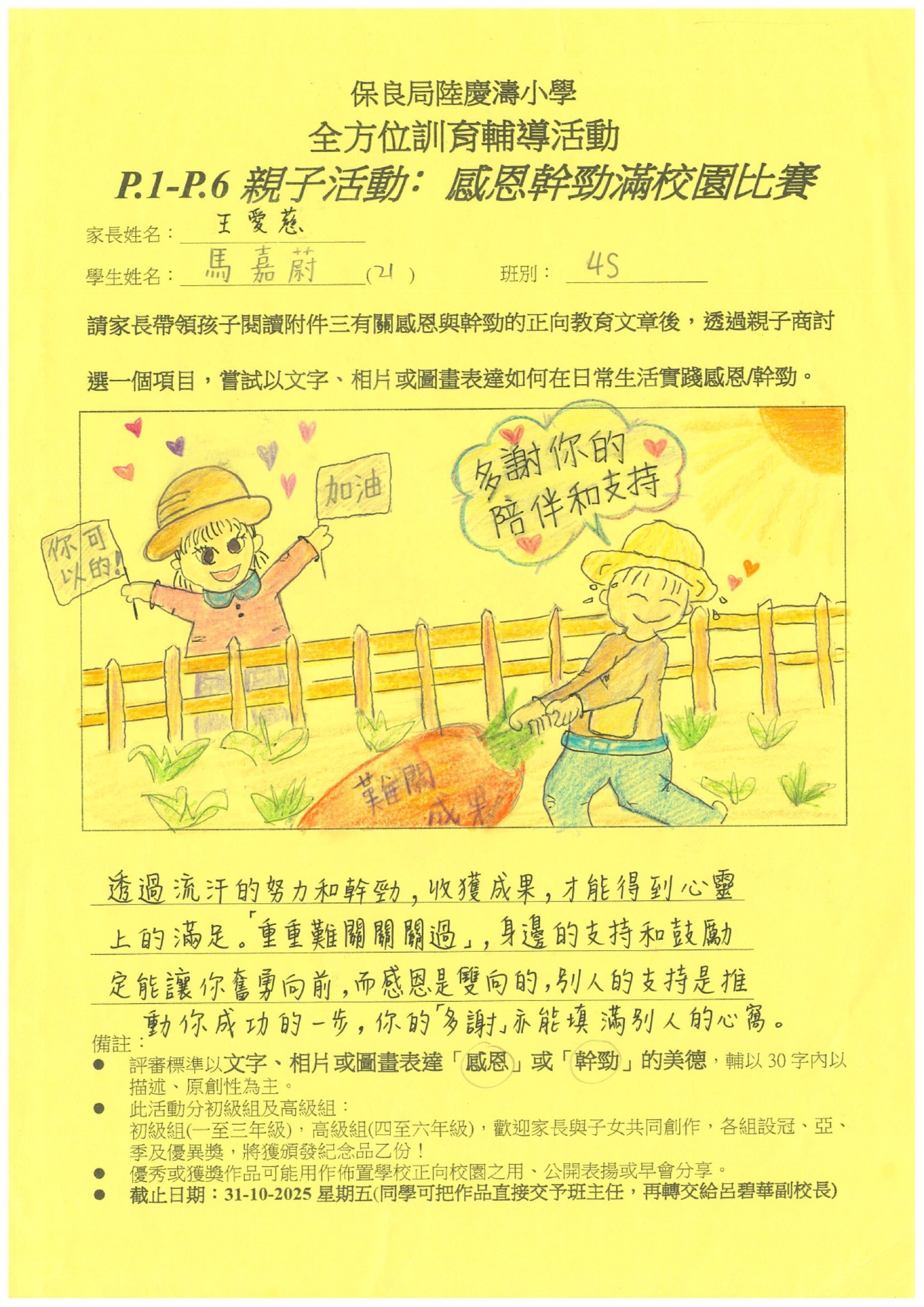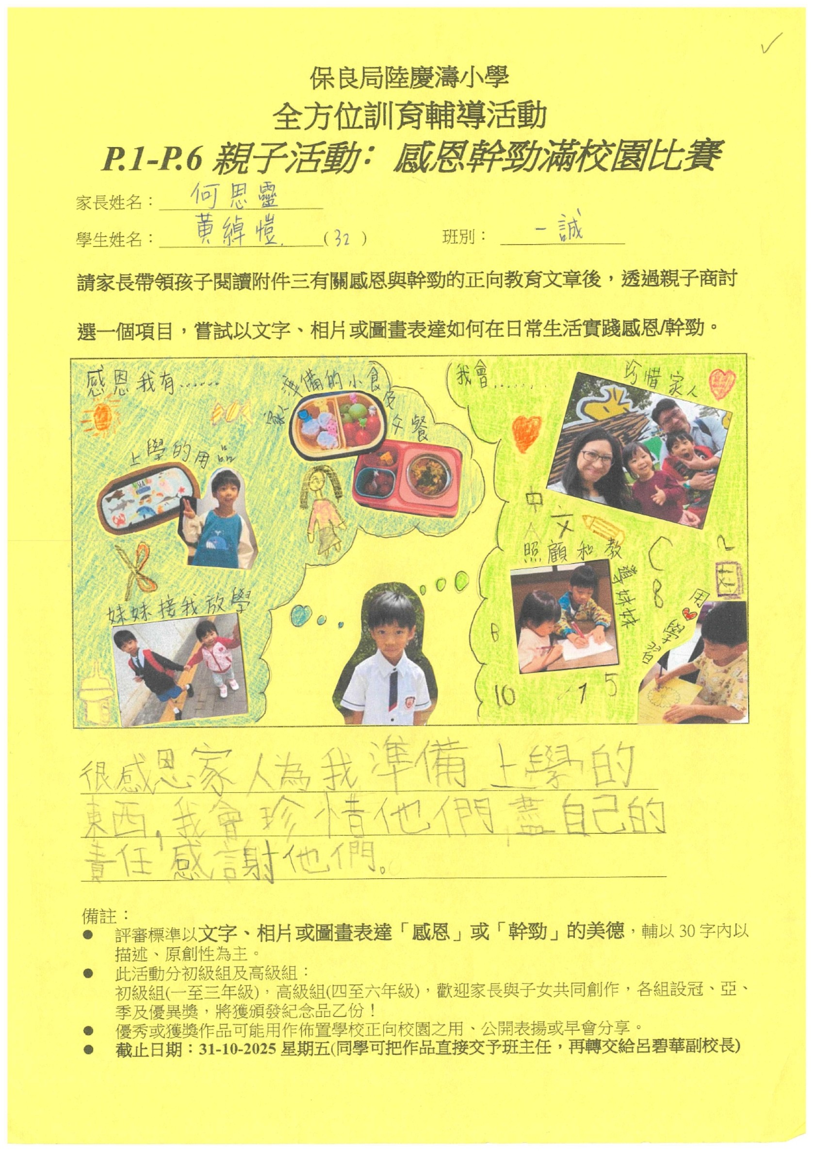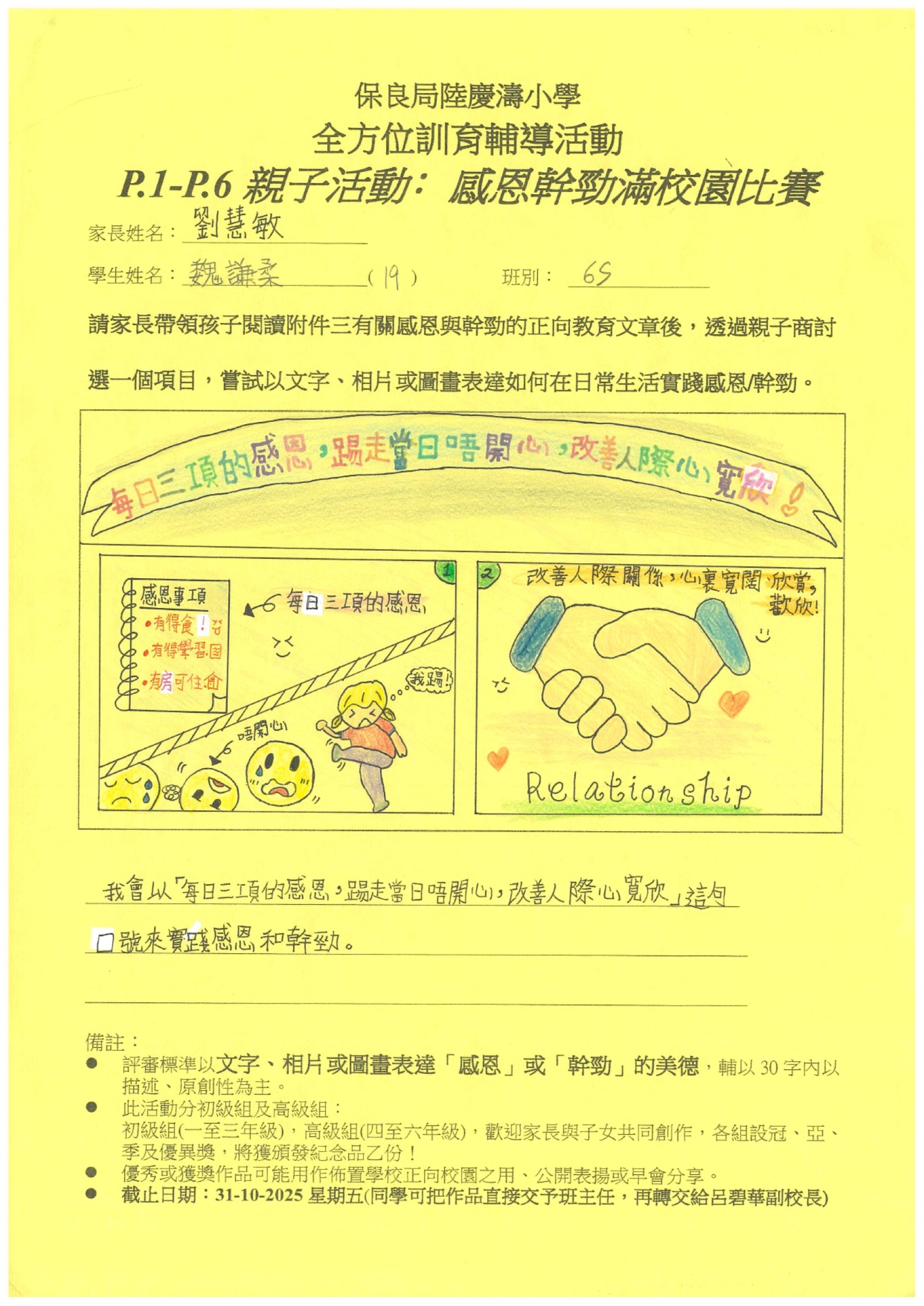 訓輔組希望邀請一至六年級家長帶領孩子閱讀有關感恩與幹勁的正向教育文章後,親子一起商討選出一個項目,嘗試以文字、相片或圖畫表達如何在日常生活實踐感恩/幹勁。