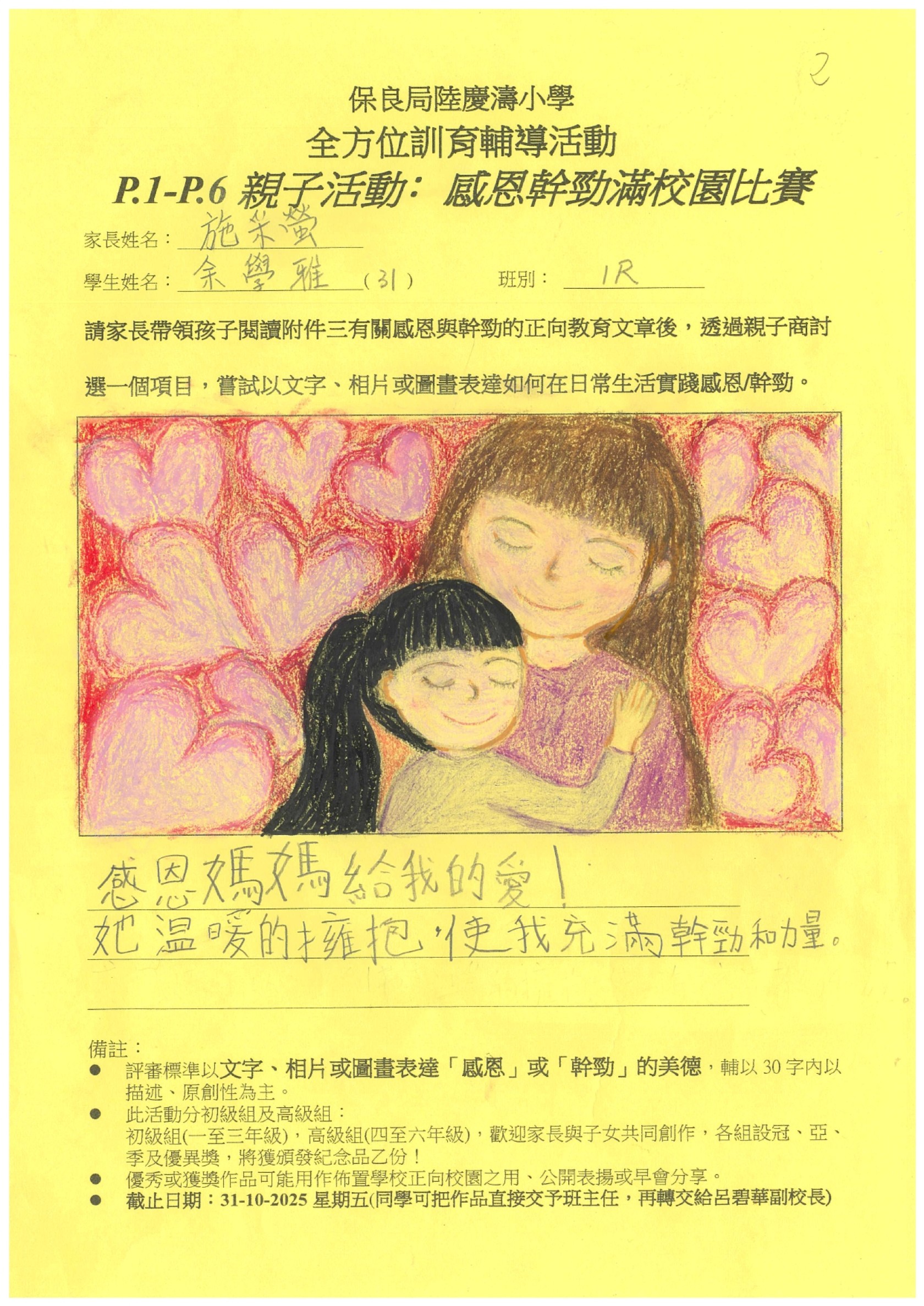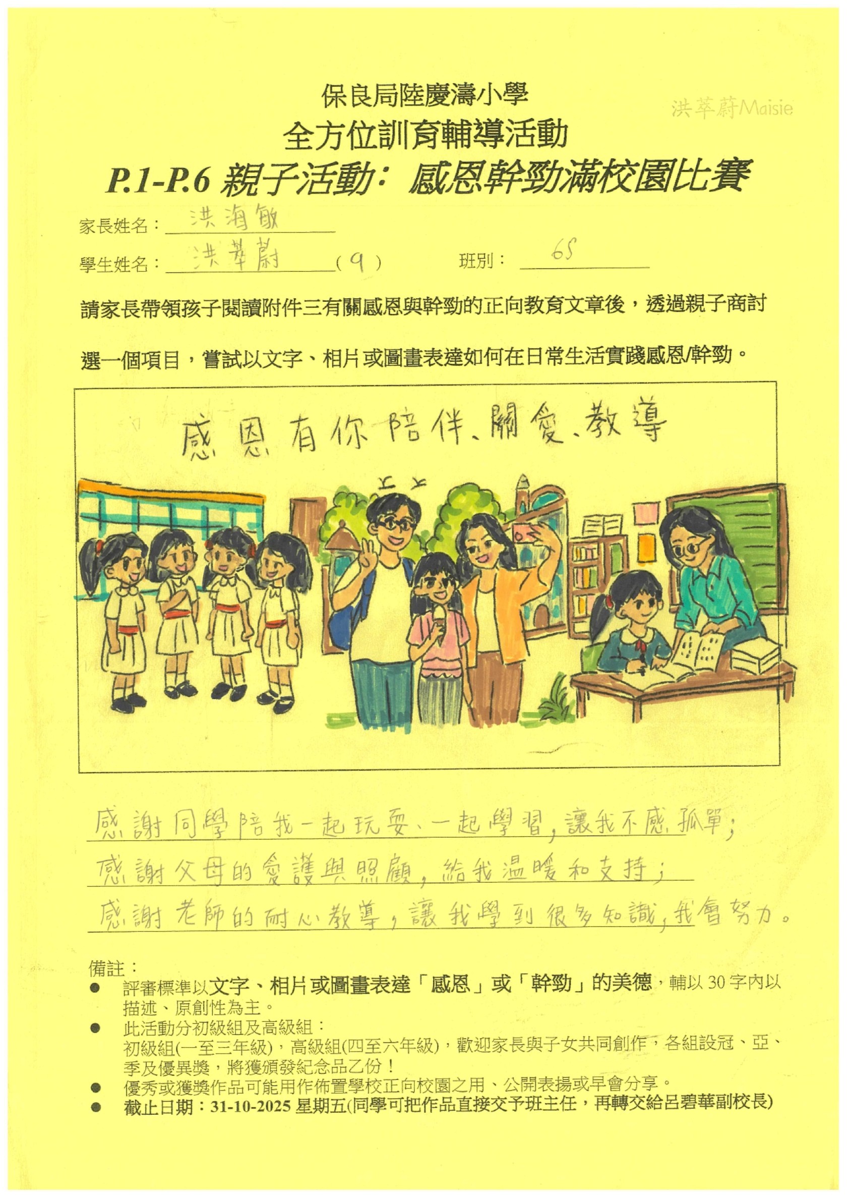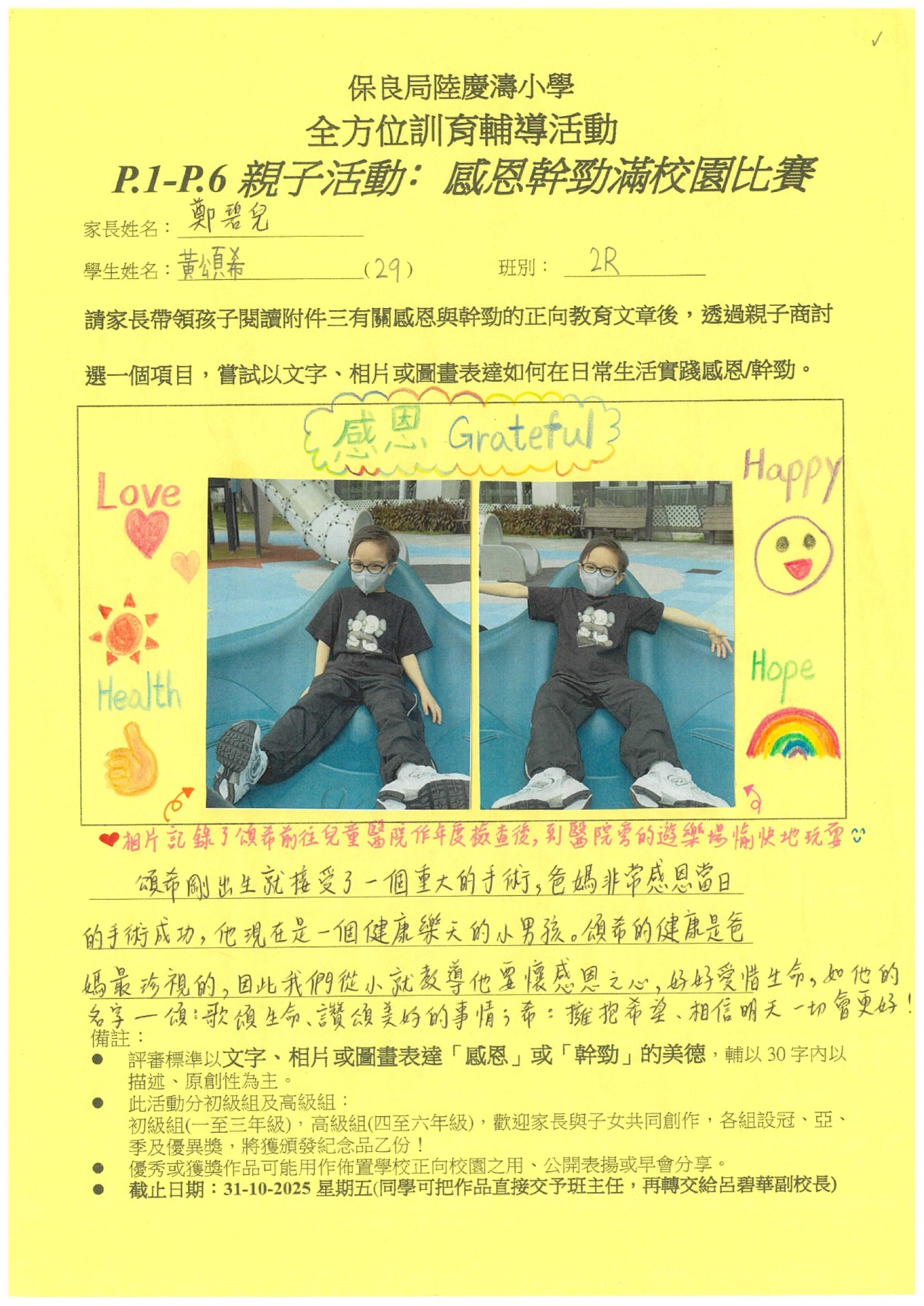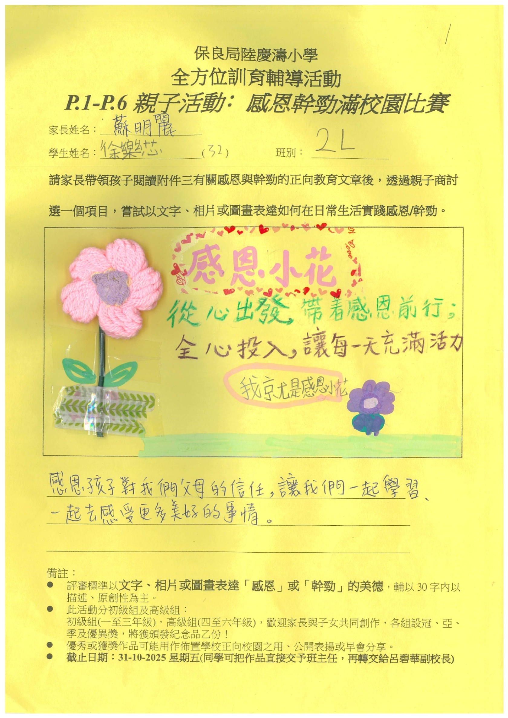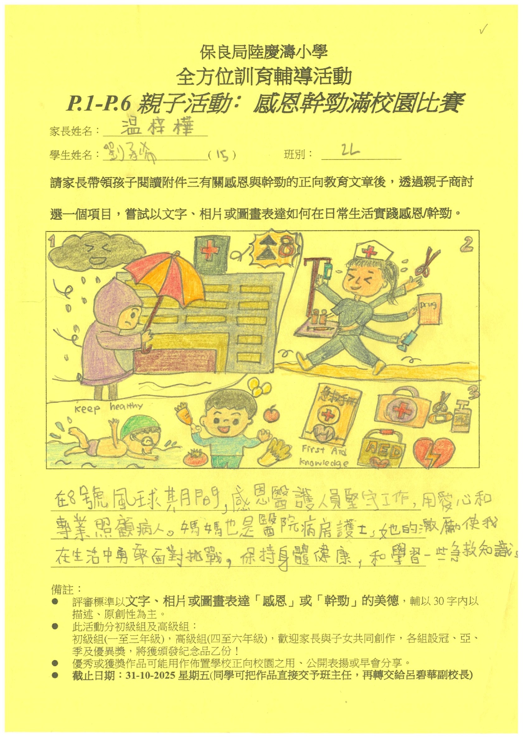 訓輔組希望邀請一至六年級家長帶領孩子閱讀有關感恩與幹勁的正向教育文章後,親子一起商討選出一個項目,嘗試以文字、相片或圖畫表達如何在日常生活實踐感恩/幹勁。